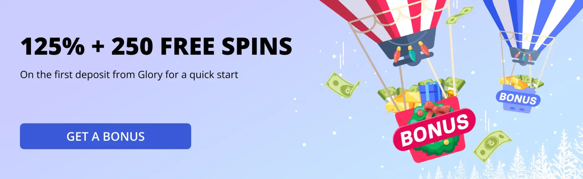 One of the best things about betting online is the great variety of casino bonuses and promotions available. Glory Casino offers a Welcome Bonus package with a 125% cashback and over 250 Free Spins. New users can increase their welcome bonus offer by adding their first deposit within an hour after registration. Here you can learn how to unlock the Glory Casino Welcome package:Bonus Type | Description | Triggering |